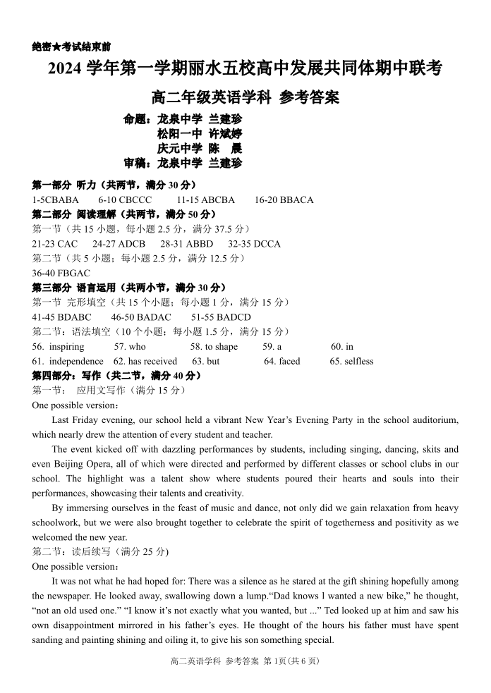 浙江省丽水五校高中发展共同体2024-2025学年上高二期中联考英语答案