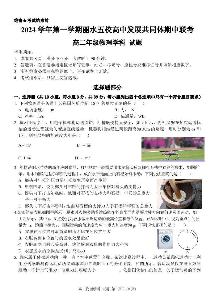 浙江省丽水五校高中发展共同体2024-2025学年上高二期中联考物理