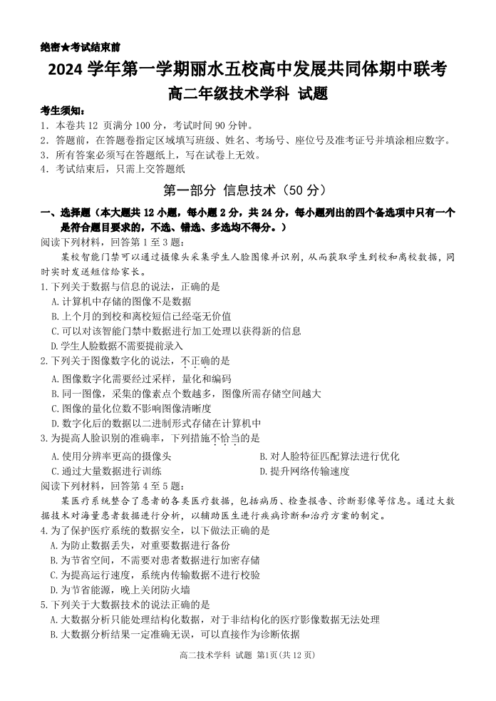 浙江省丽水五校高中发展共同体2024-2025学年上高二期中联考技术