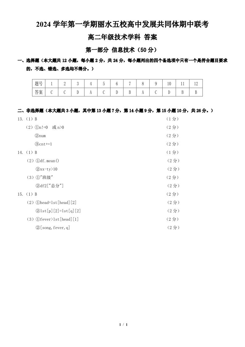浙江省丽水五校高中发展共同体2024-2025学年上高二期中联考技术答案