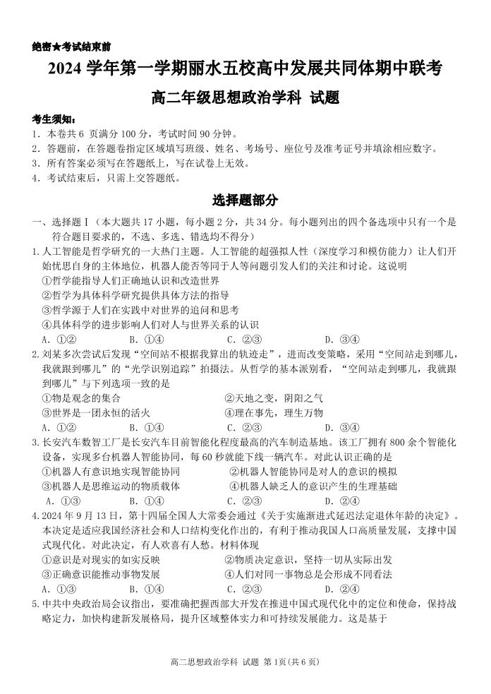 浙江省丽水五校高中发展共同体2024-2025学年上高二期中联考政治