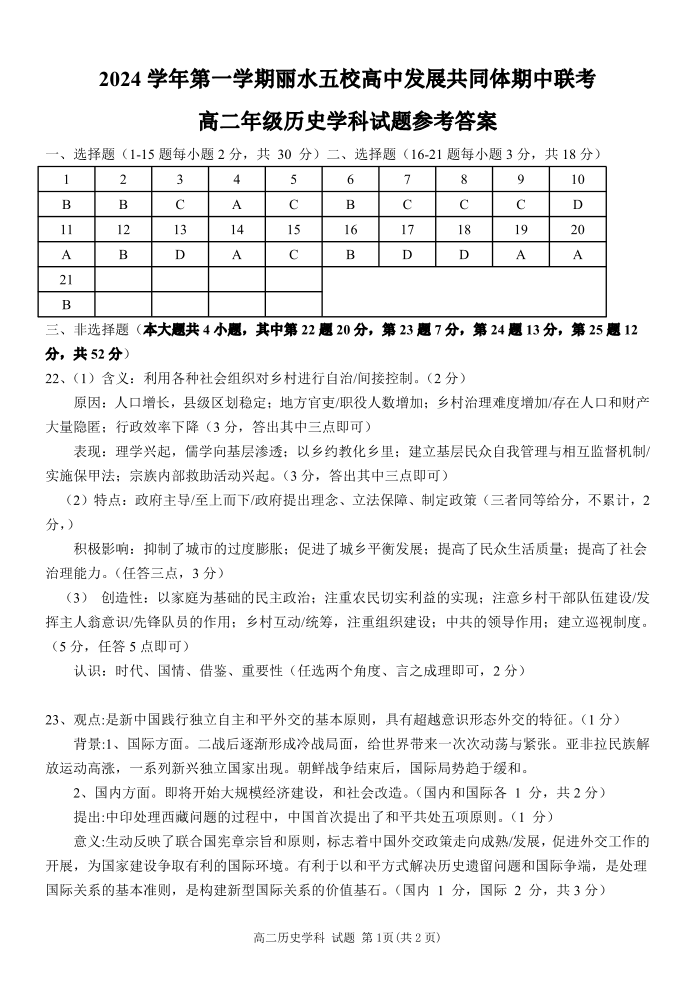 浙江省丽水五校高中发展共同体2024-2025学年上高二期中联考历史答案