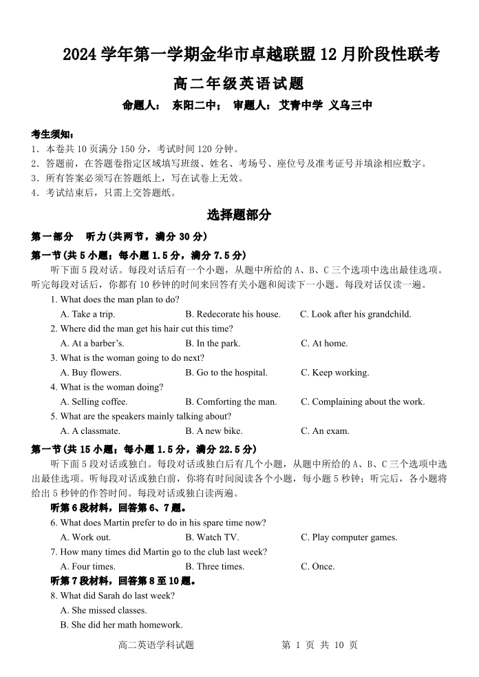 浙江省金华市卓越联盟2024-2025学年高二12月阶段性联考英语