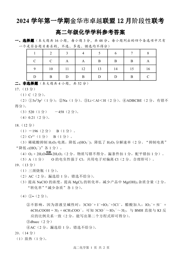 浙江省金华市卓越联盟2024-2025学年高二12月阶段性联考化学答案