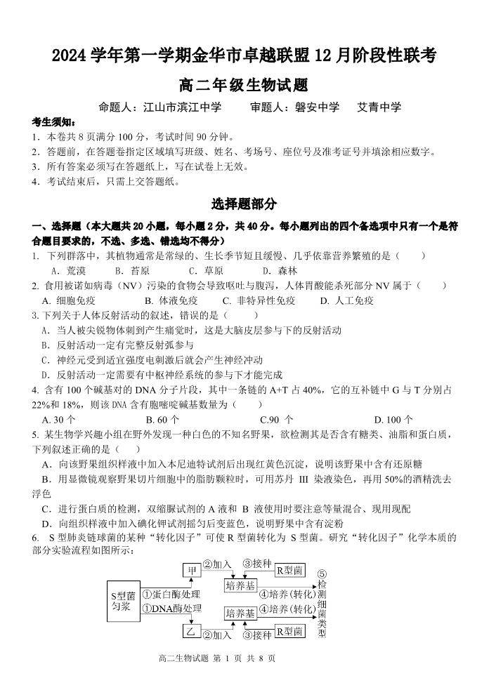 浙江省金华市卓越联盟2024-2025学年高二12月阶段性联考生物