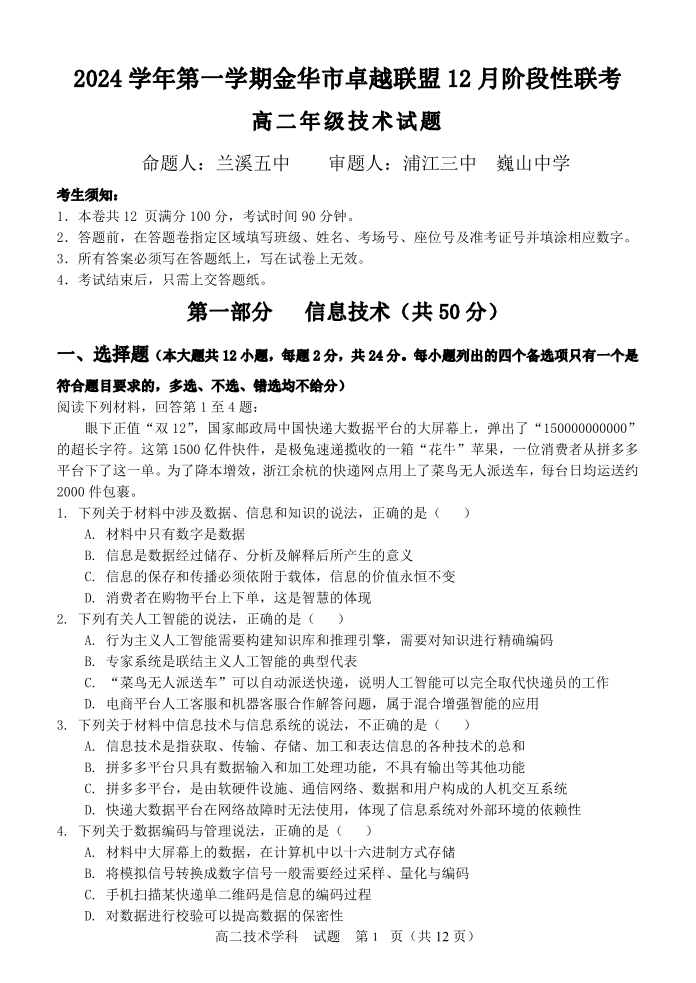 浙江省金华市卓越联盟2024-2025学年高二12月阶段性联考技术