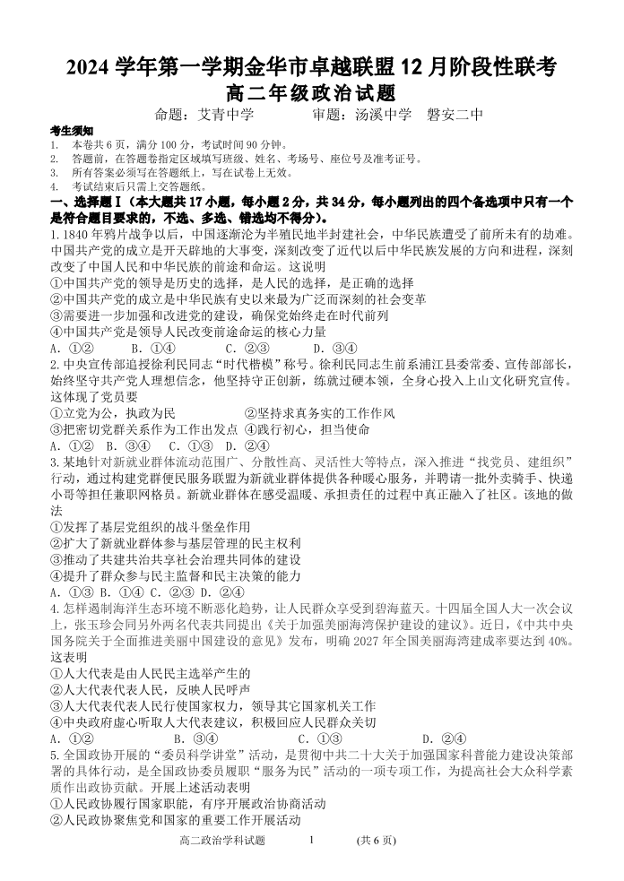 浙江省金华市卓越联盟2024-2025学年高二12月阶段性联考政治