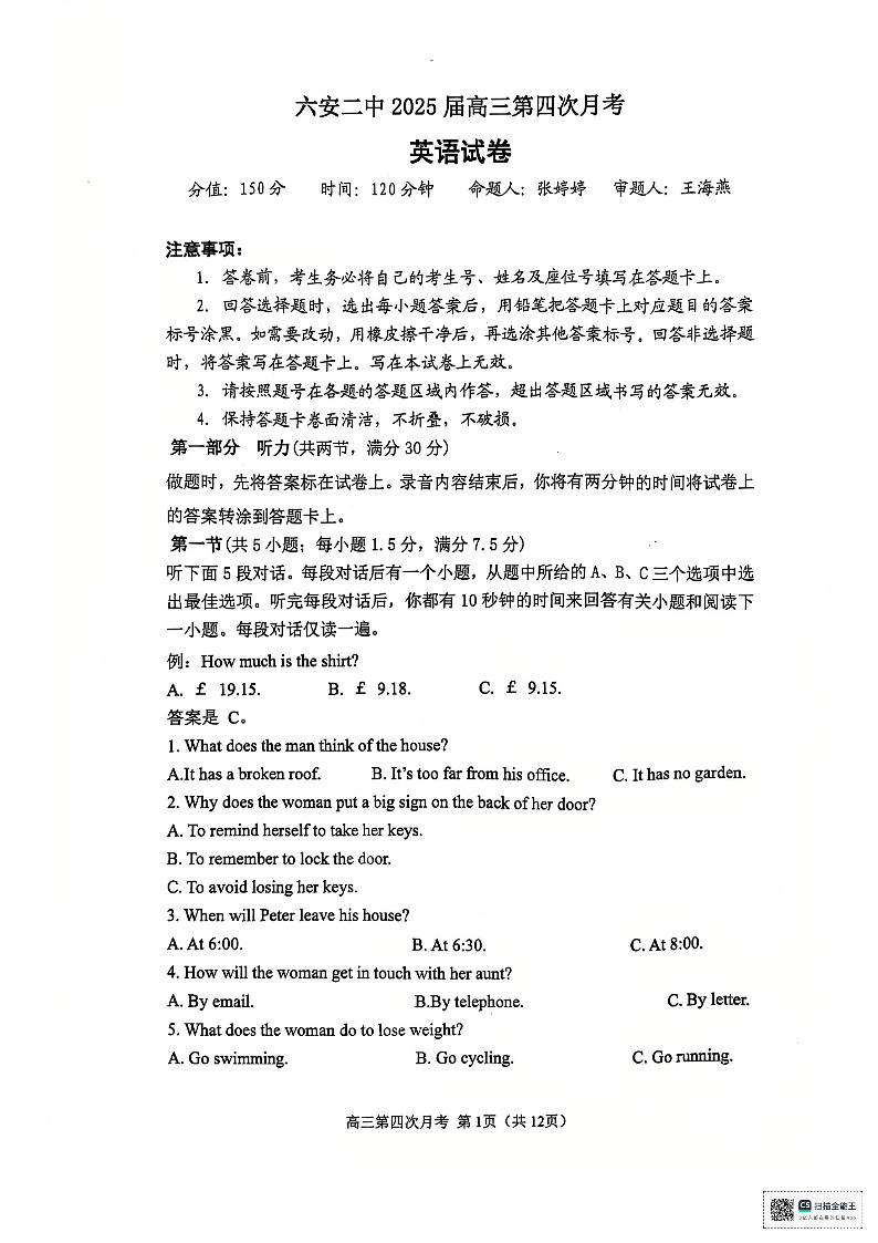 安徽省六安市第二中学2025届高三上学期12月第四次月考英语+答案