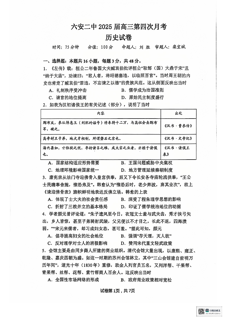 安徽省六安市第二中学2025届高三上学期12月第四次月考历史+答案