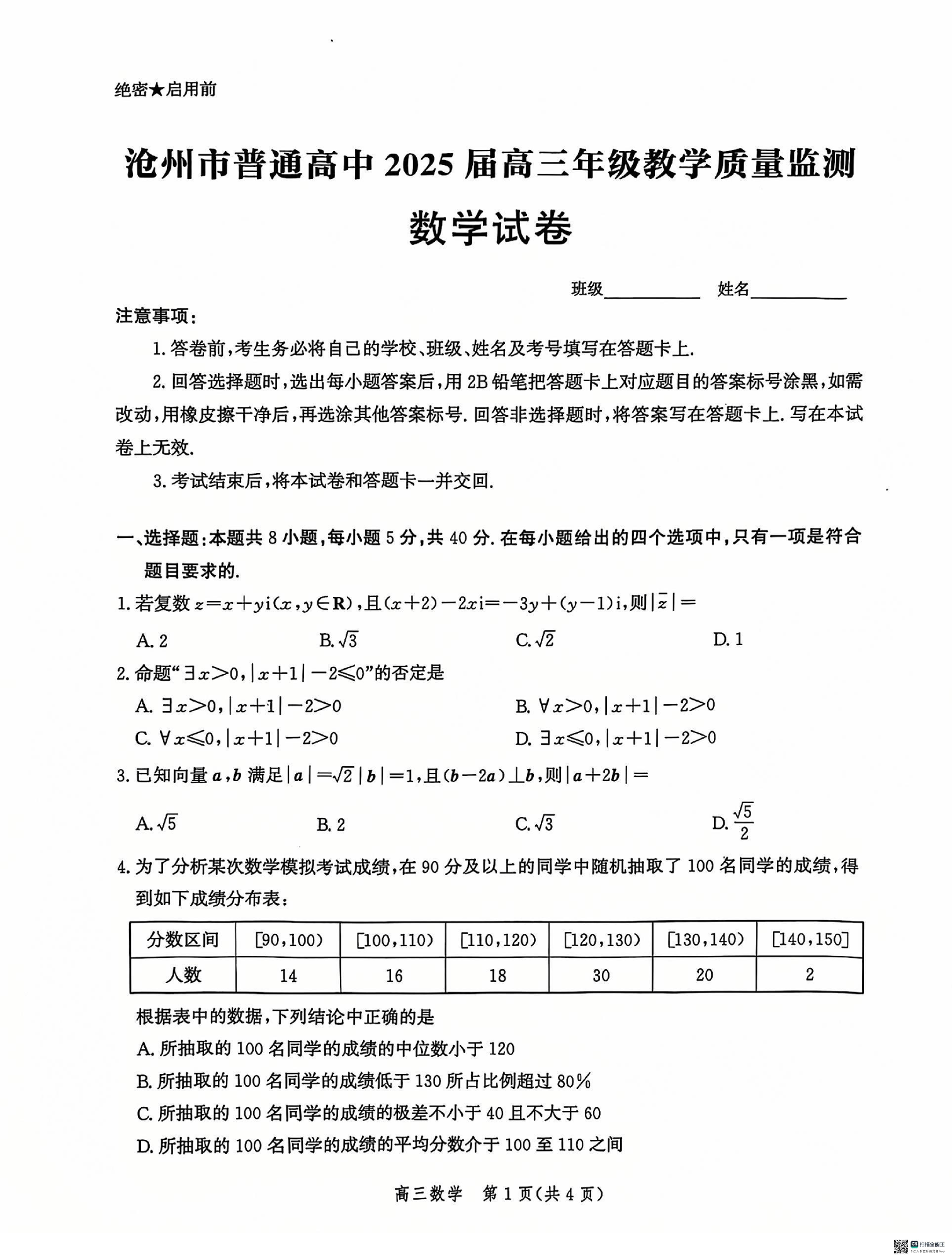 河北省沧州市普通高中2025届高三年级12月教学质量监测数学+答案