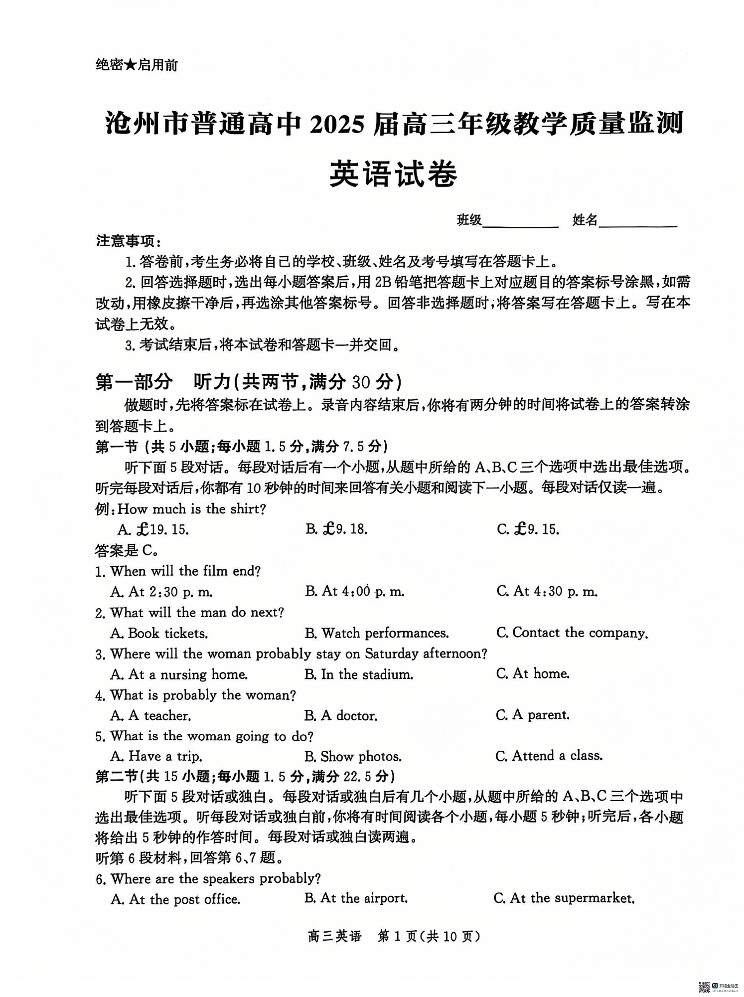 河北省沧州市普通高中2025届高三年级12月教学质量监测英语+答案