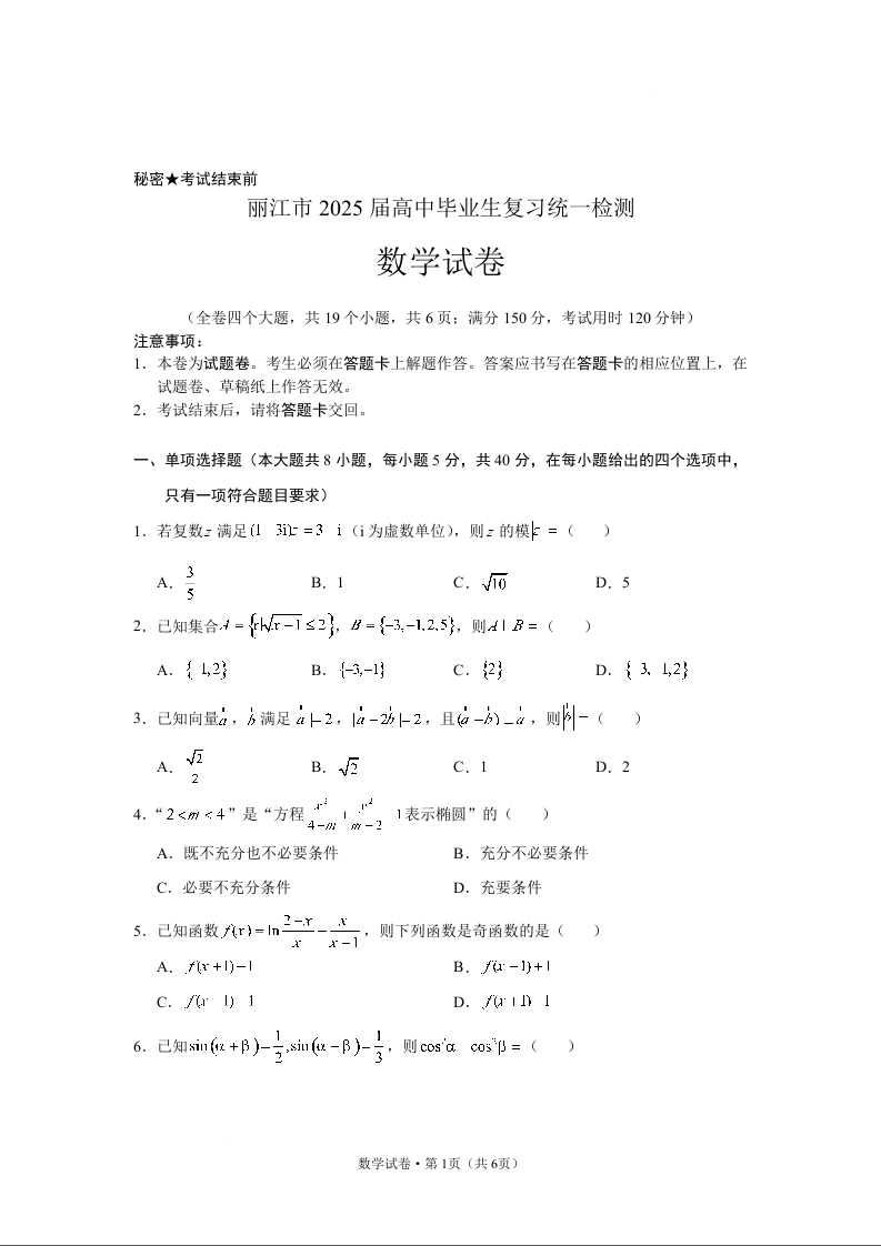云南省丽江市高中2025届高三毕业生12月复习统一检测数学
