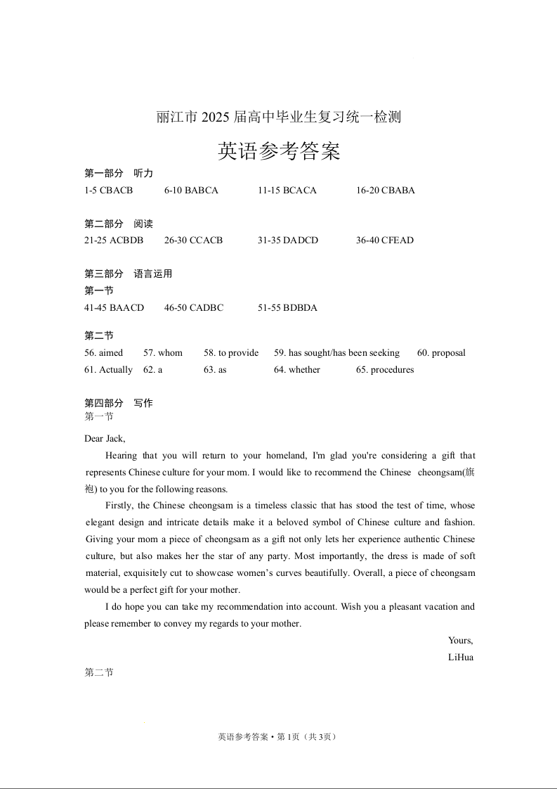 云南省丽江市高中2025届高三毕业生12月复习统一检测英语答案