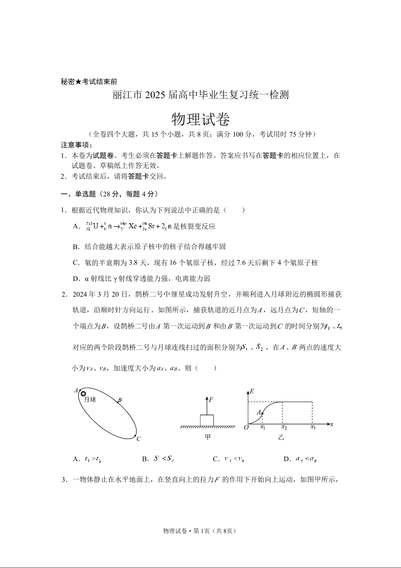 云南省丽江市高中2025届高三毕业生12月复习统一检测物理