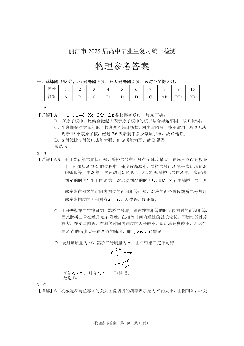 云南省丽江市高中2025届高三毕业生12月复习统一检测物理答案