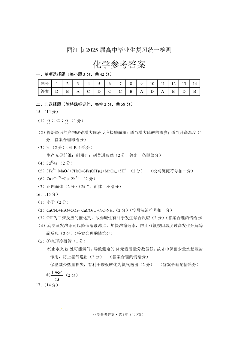云南省丽江市高中2025届高三毕业生12月复习统一检测化学答案