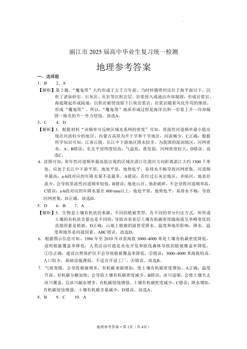 云南省丽江市高中2025届高三毕业生12月复习统一检测地理答案