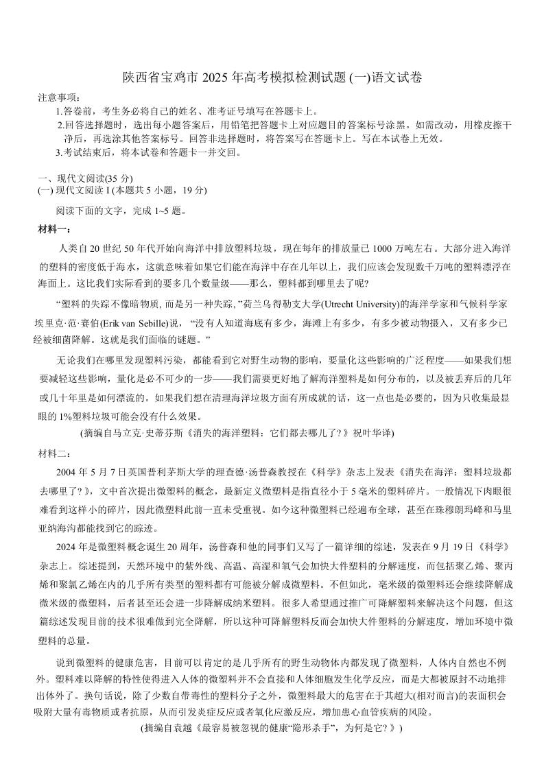 陕西省宝鸡市2025届高三上学期高考模拟检测(一)语文+答案