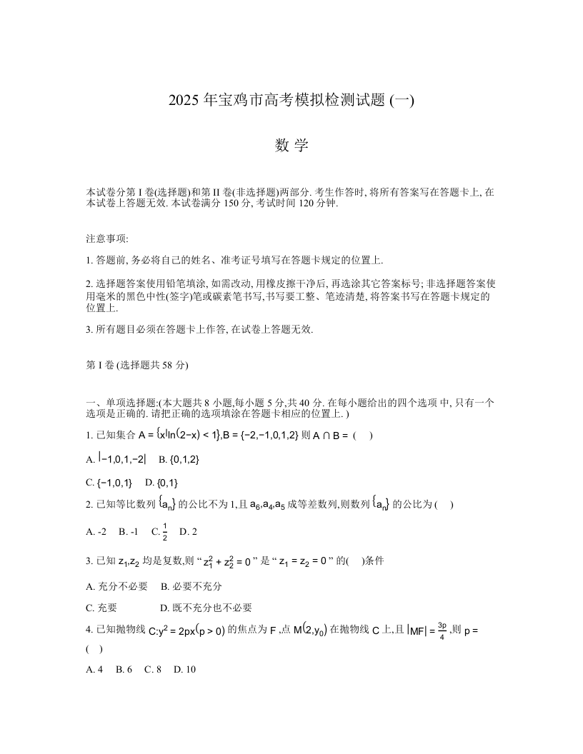 陕西省宝鸡市2025届高三上学期高考模拟检测(一)数学