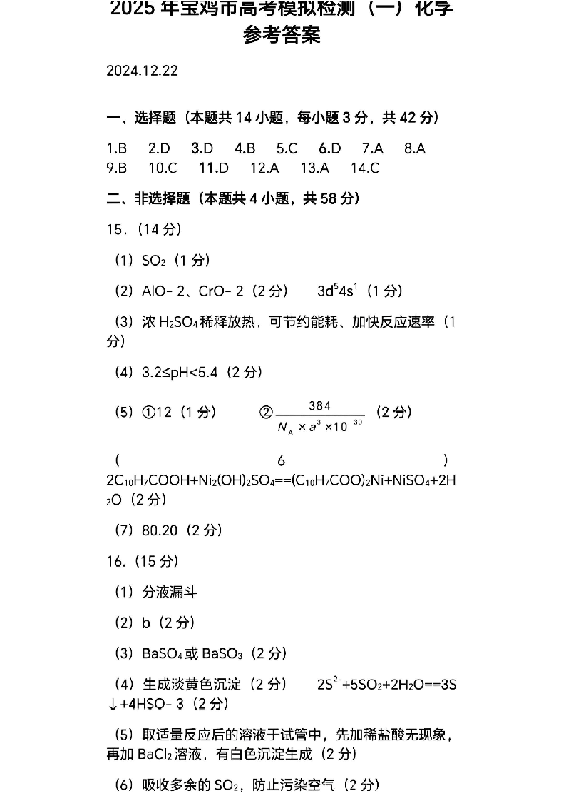 陕西省宝鸡市2025届高三上学期高考模拟检测(一)化学答案