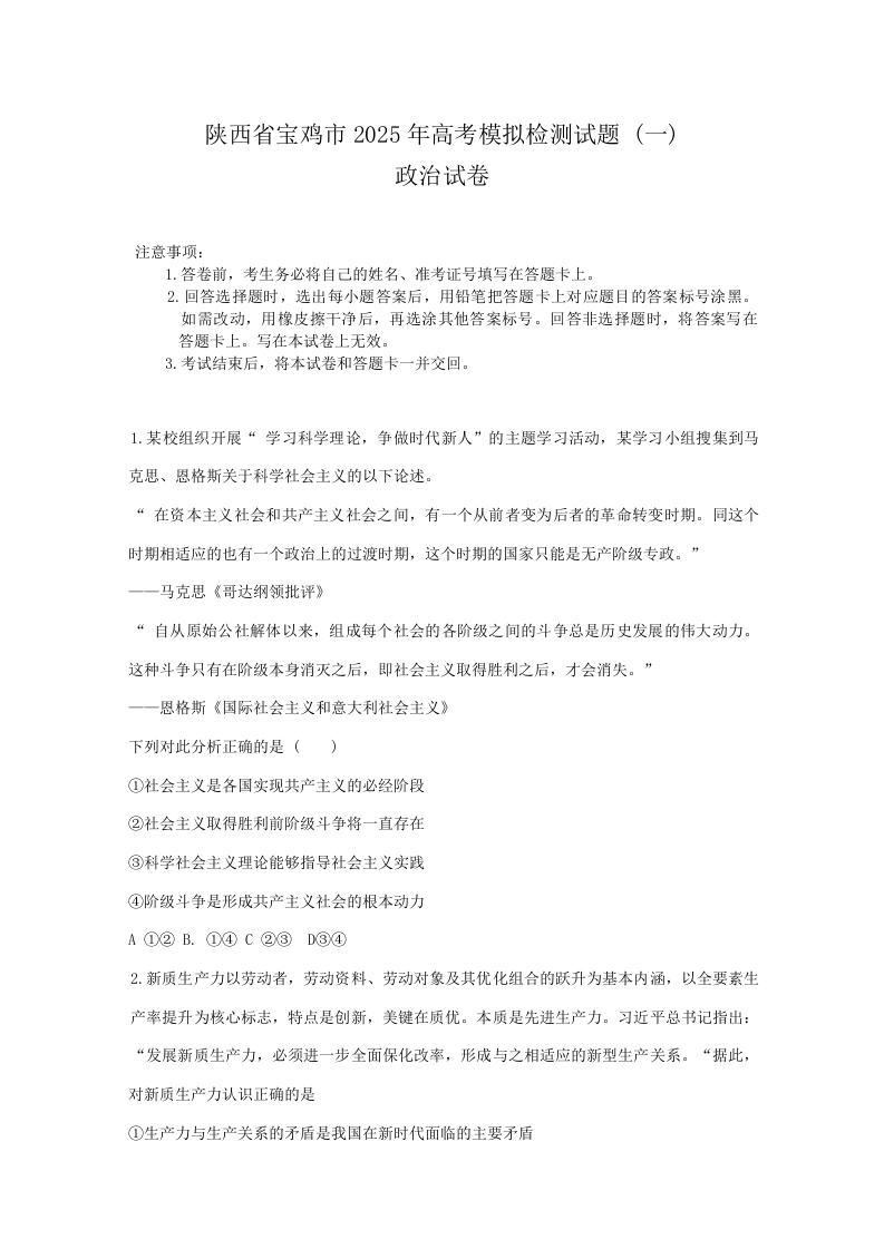 陕西省宝鸡市2025届高三上学期高考模拟检测(一)政治