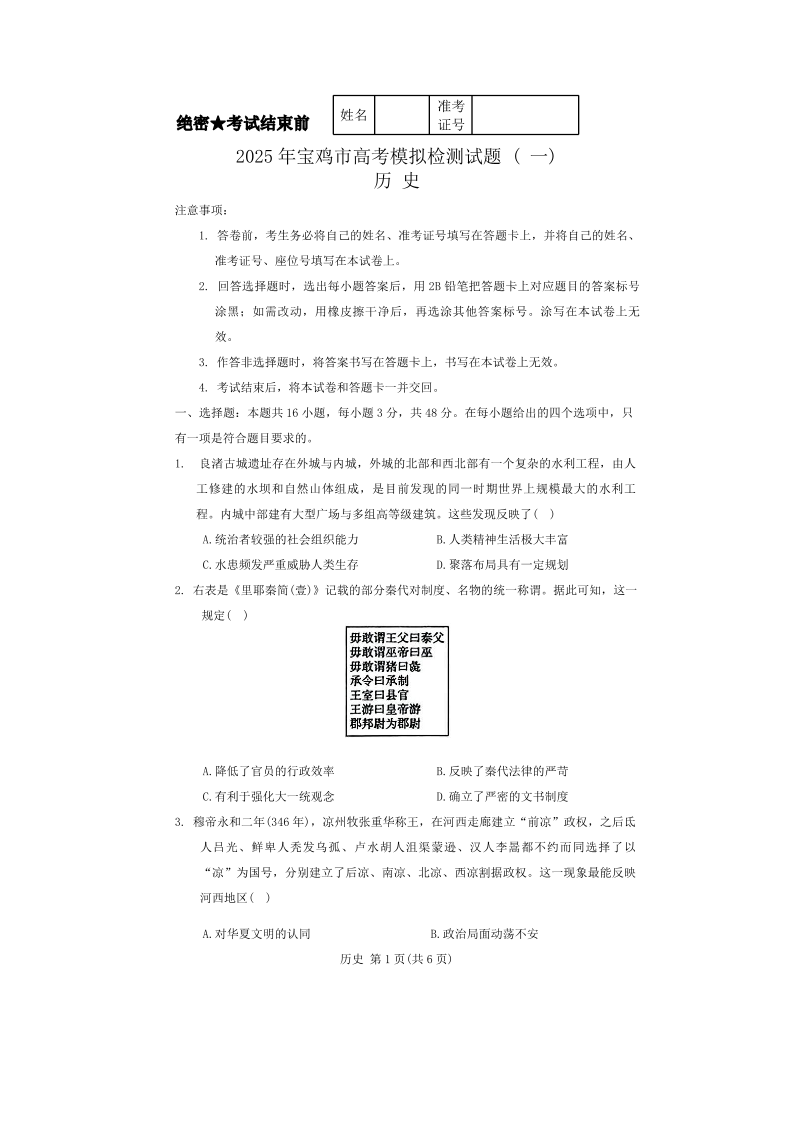 陕西省宝鸡市2025届高三上学期高考模拟检测(一)历史