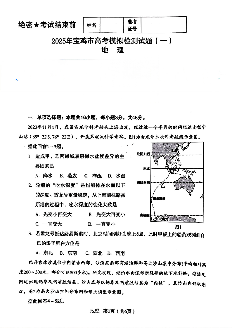 陕西省宝鸡市2025届高三上学期高考模拟检测(一)地理