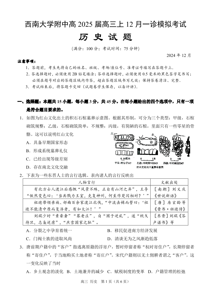 重庆市西南大学附属中学2025届高三一诊模拟考试历史