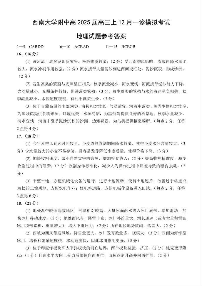 重庆市西南大学附属中学2025届高三一诊模拟考试地理答案