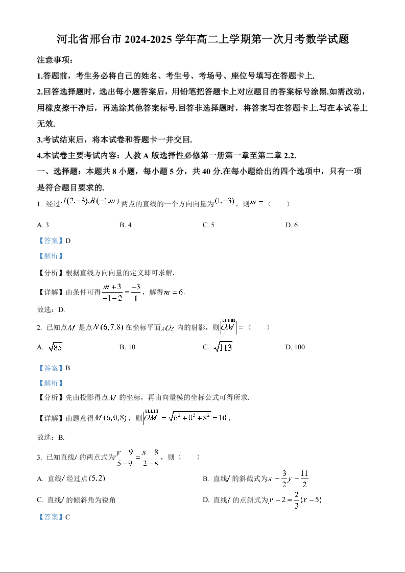 河北省邢台市2024-2025学年高二上学期第一次月考数学(解析版)