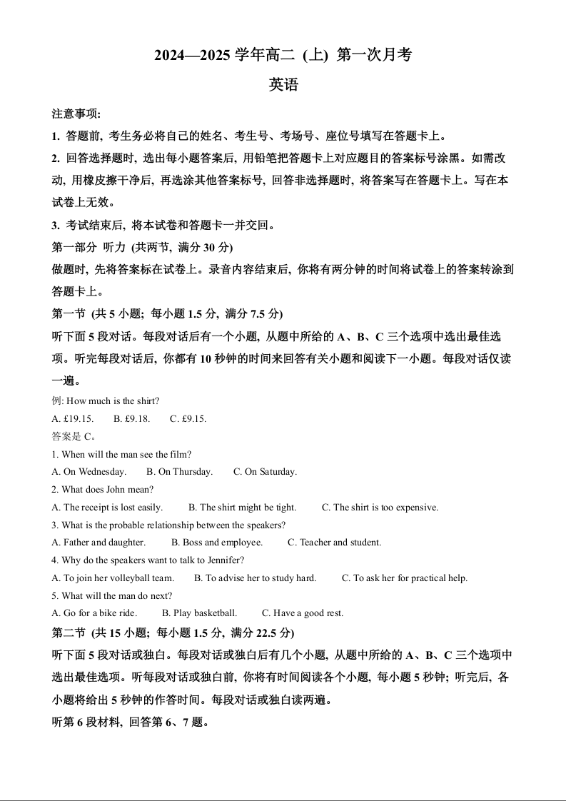 河北省邢台市2024-2025学年高二上学期第一次月考英语(解析版)