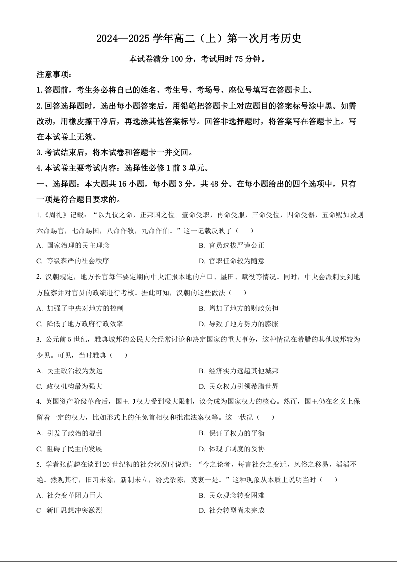河北省邢台市2024-2025学年高二上学期第一次月考历史(原卷版)