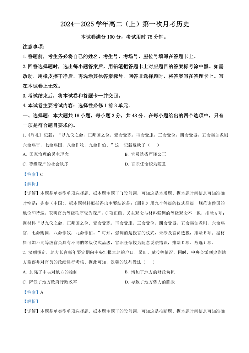 河北省邢台市2024-2025学年高二上学期第一次月考历史(解析版)