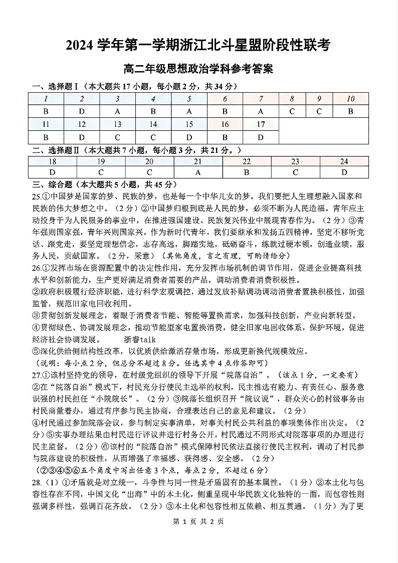 浙江北斗星盟阶段性联考2024-2025学年高二联考试题政治答案