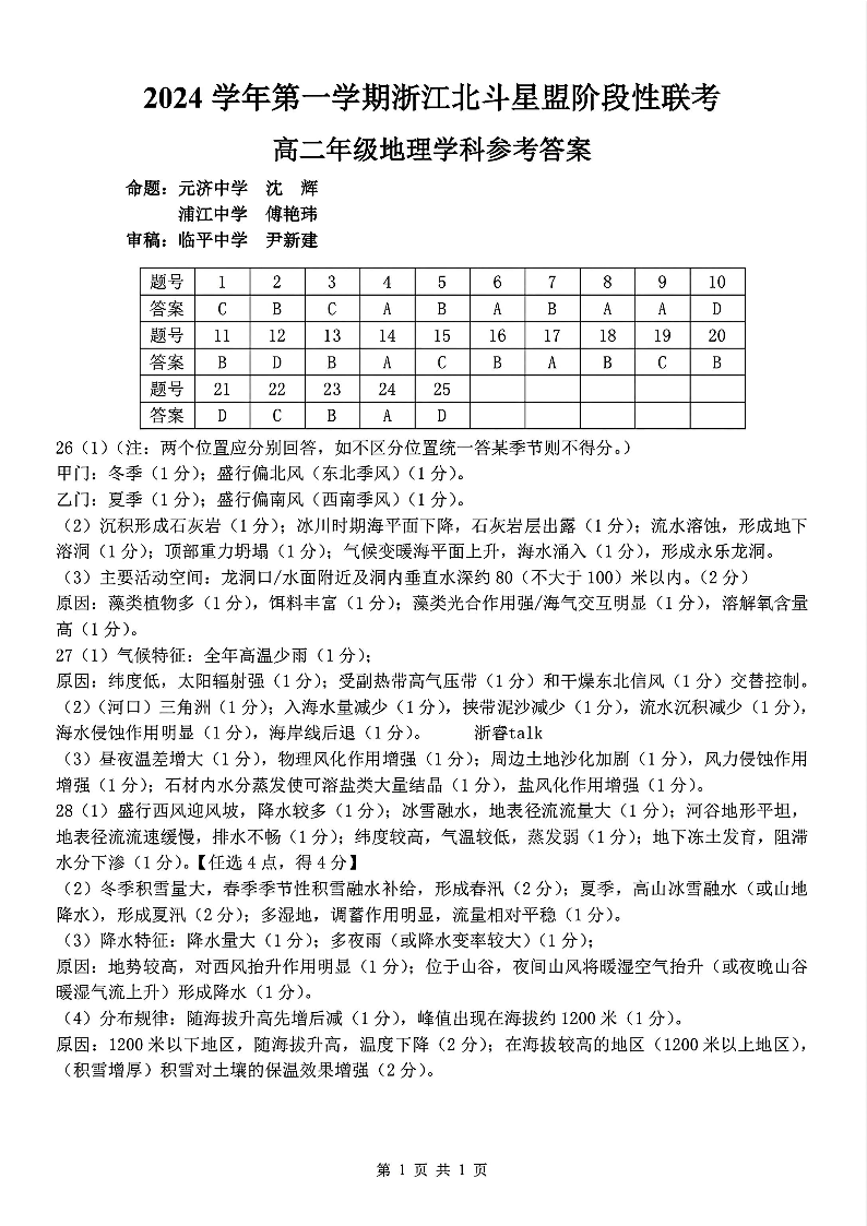 (已压缩)浙江北斗星盟阶段性联考2024-2025学年高二联考试题地理答案