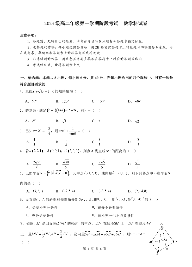 广东省汕头市金山中学2023级高二第一学期阶段考试数学+答案