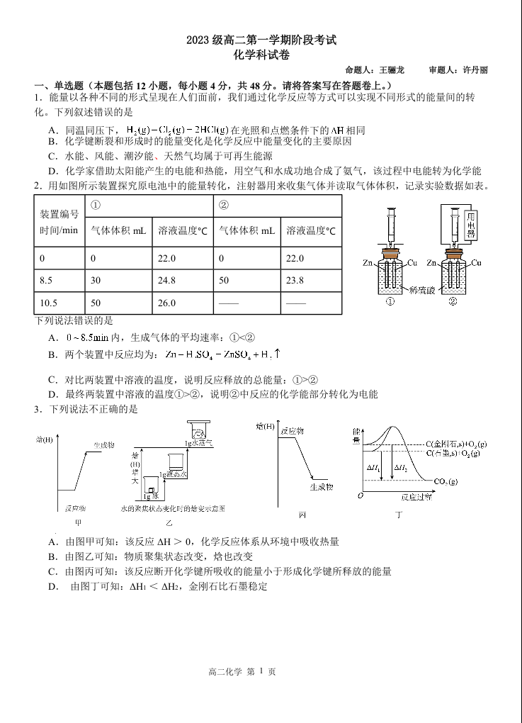 广东省汕头市金山中学2023级高二第一学期阶段考试化学