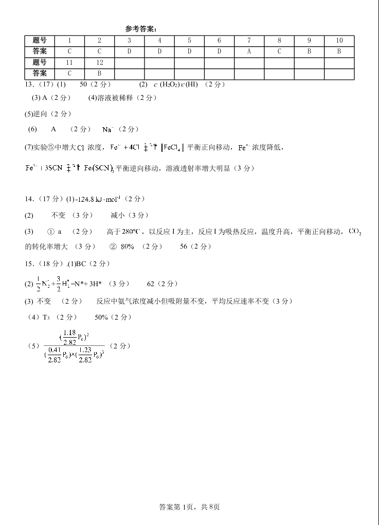 广东省汕头市金山中学2023级高二第一学期阶段考试化学答案