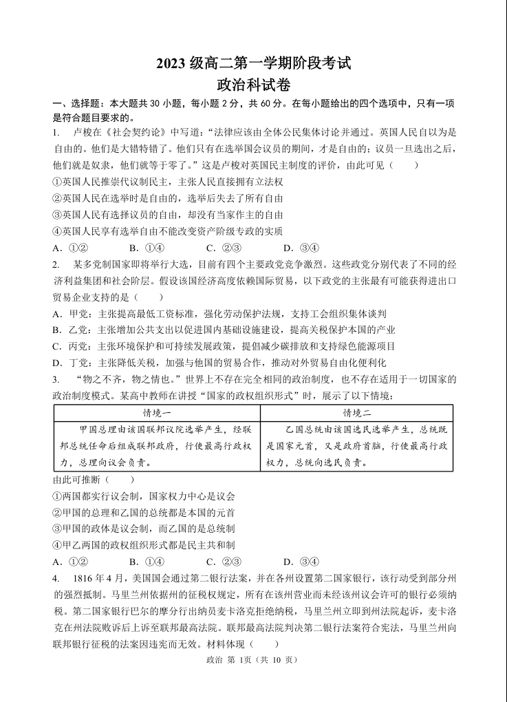 广东省汕头市金山中学2023级高二第一学期阶段考试政治