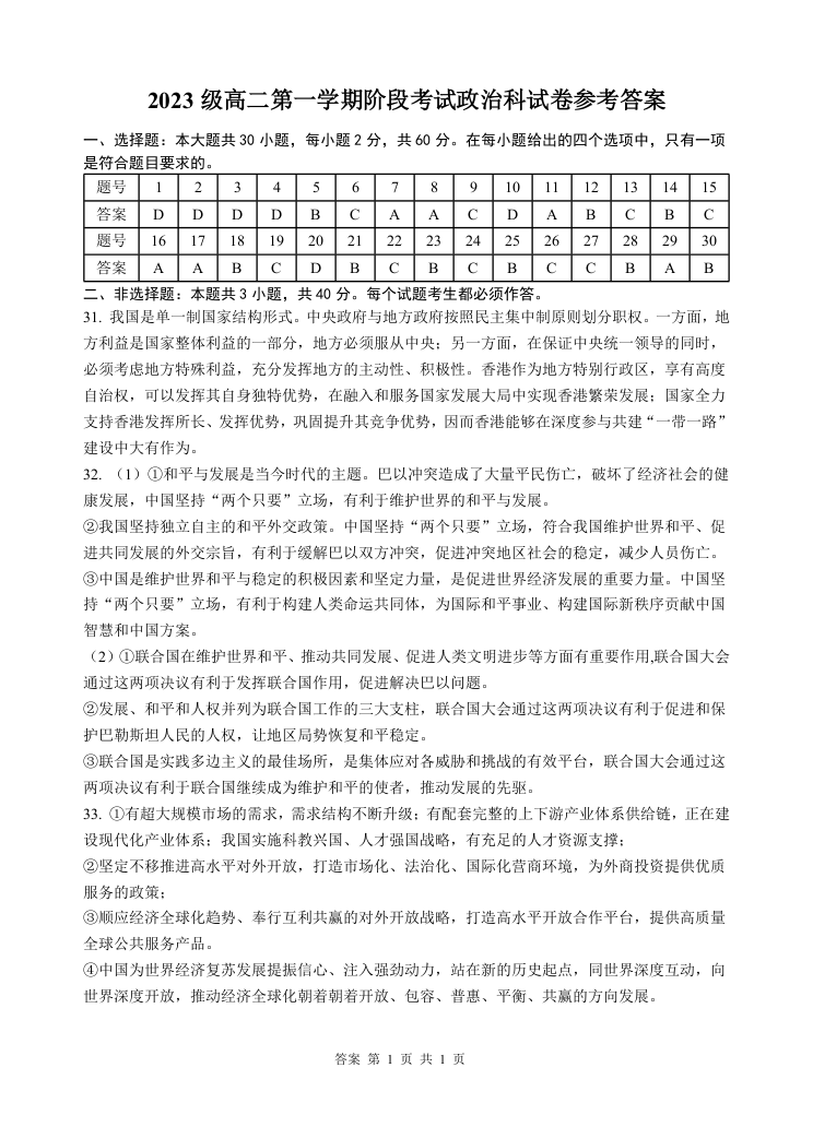 广东省汕头市金山中学2023级高二第一学期阶段考试政治答案