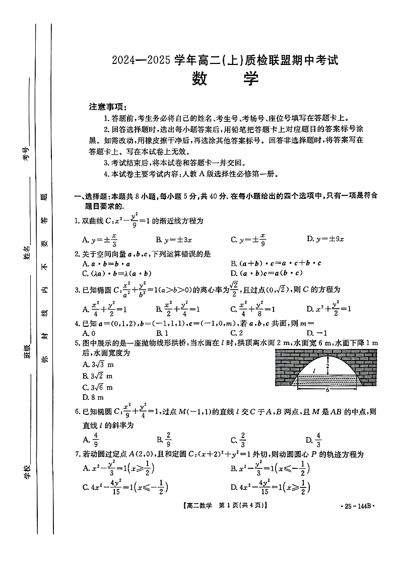 河北省邢台市2024-2025学年高二(上)质检联盟期中考试数学