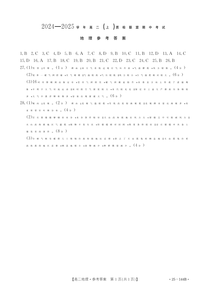 河北省邢台市2024-2025学年高二(上)质检联盟期中考试地理答案
