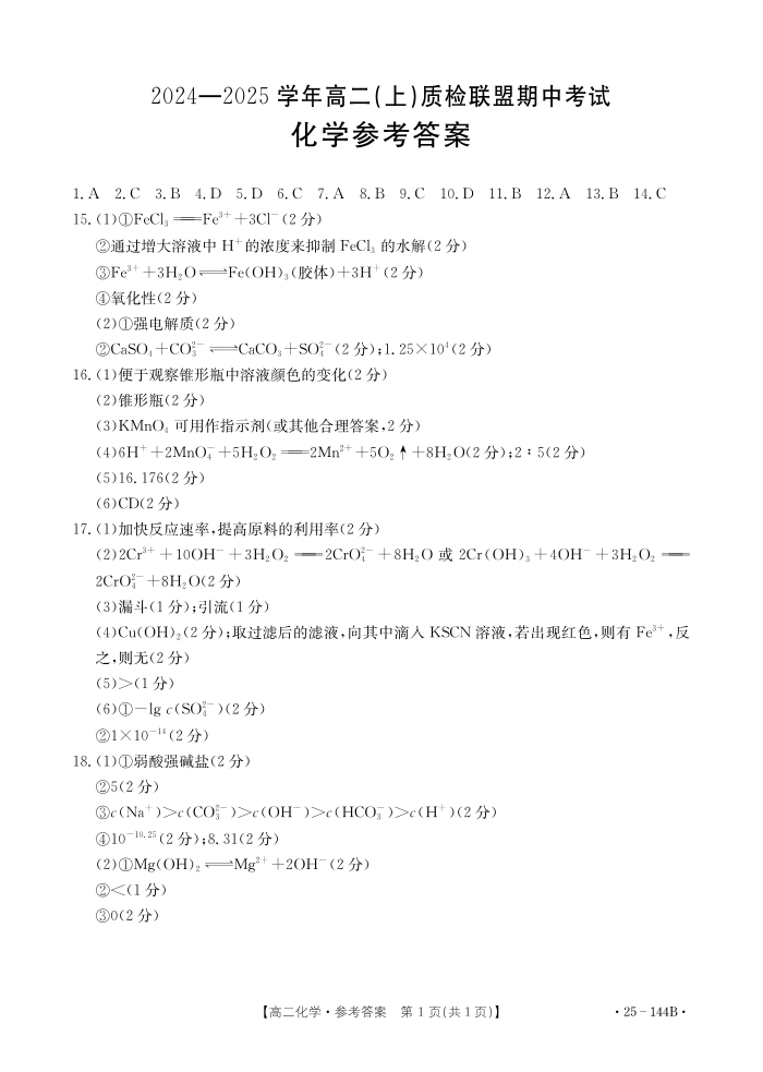 河北省邢台市2024-2025学年高二(上)质检联盟期中考试化学答案