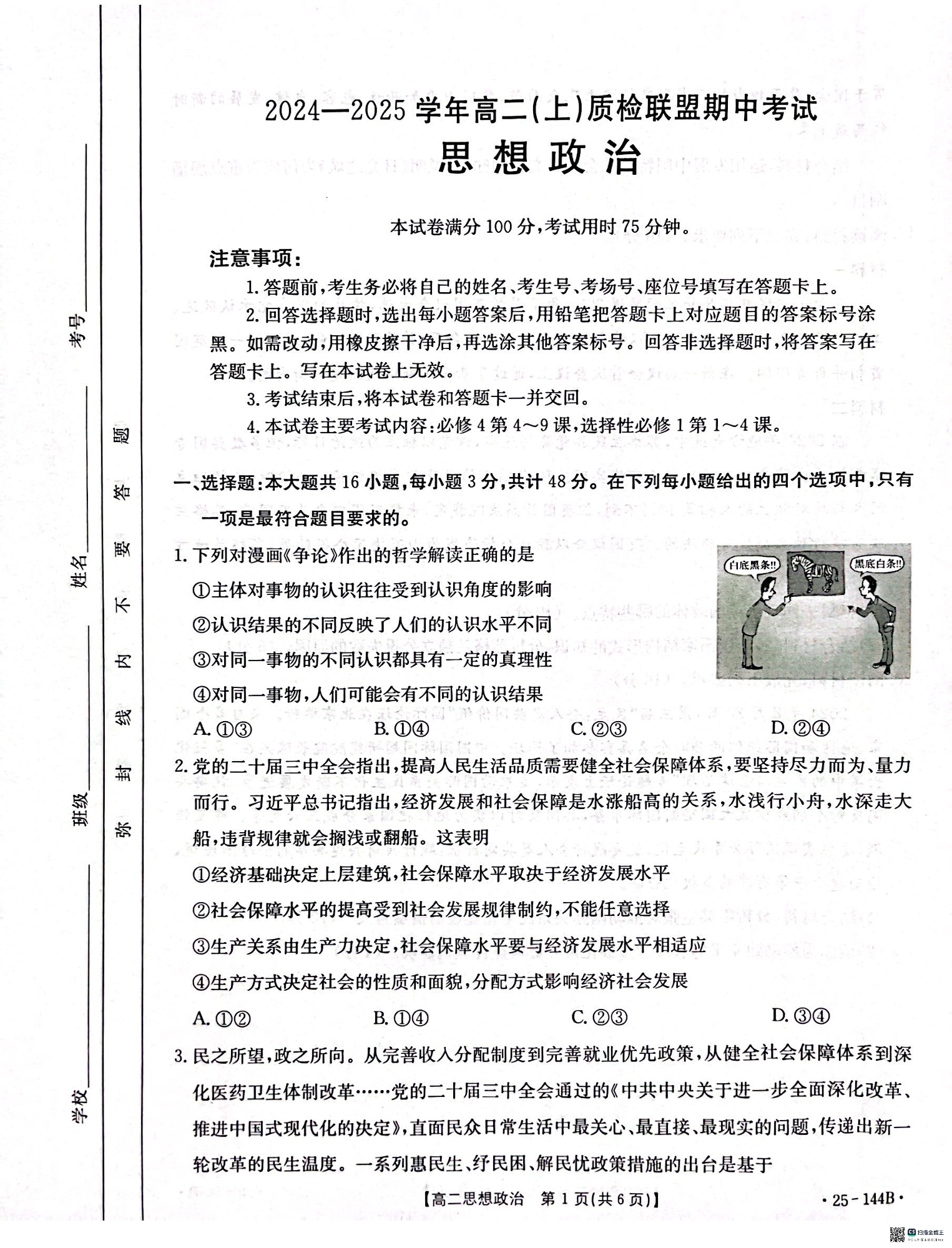 河北省邢台市2024-2025学年高二(上)质检联盟期中考试政治
