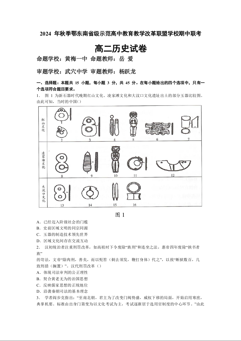 湖北省鄂东南省级示范高中教育教学改革联盟学校2024-2025学年高二上学期期中联考历史+答案