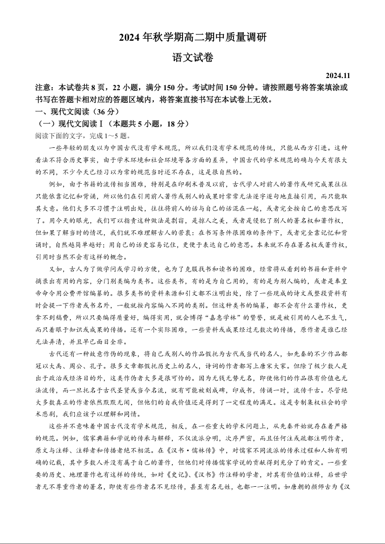江苏省常州市2024年秋学期高二期中质量检测语文