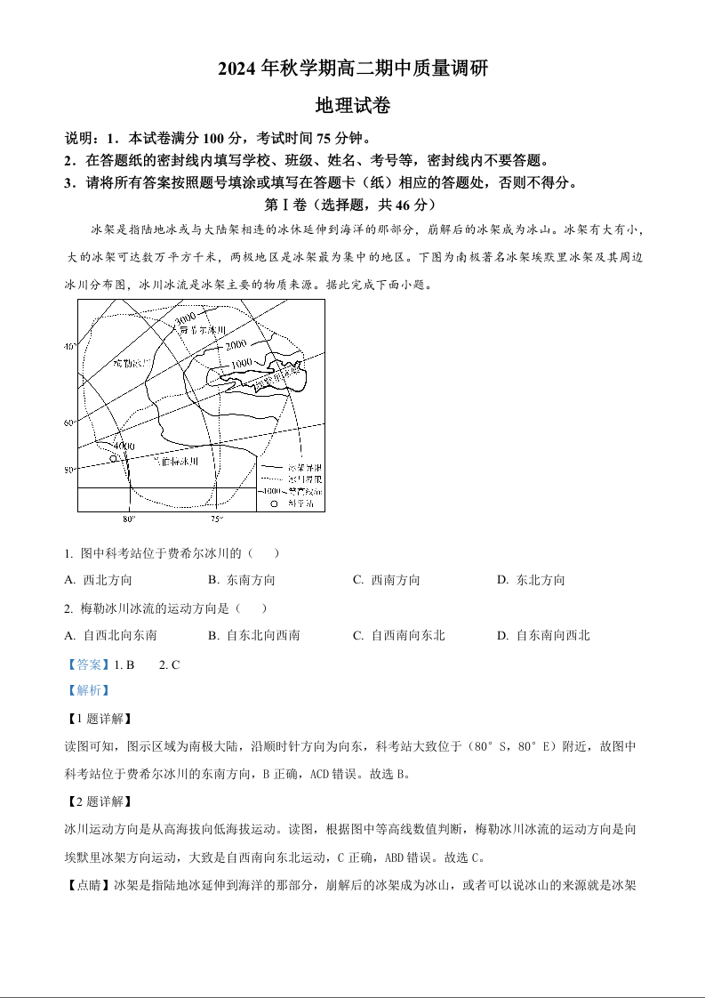 江苏省常州市2024年秋学期高二期中质量检测地理试题(解析版)