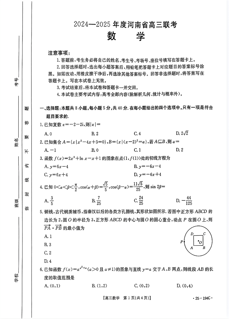 河南省部分高中2025届高三年级上学期12月联考数学