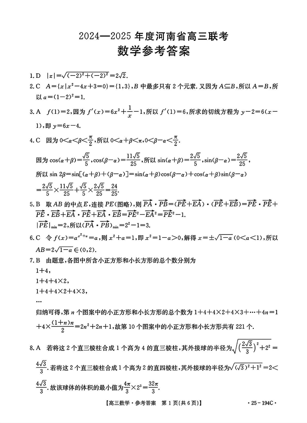 河南省部分高中2025届高三年级上学期12月联考数学答案
