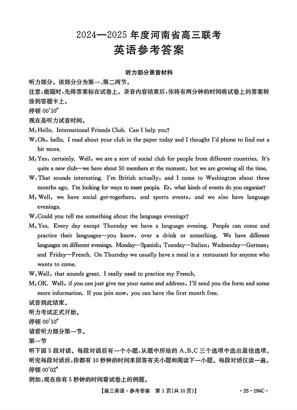 河南省部分高中2025届高三年级上学期12月联考英语答案